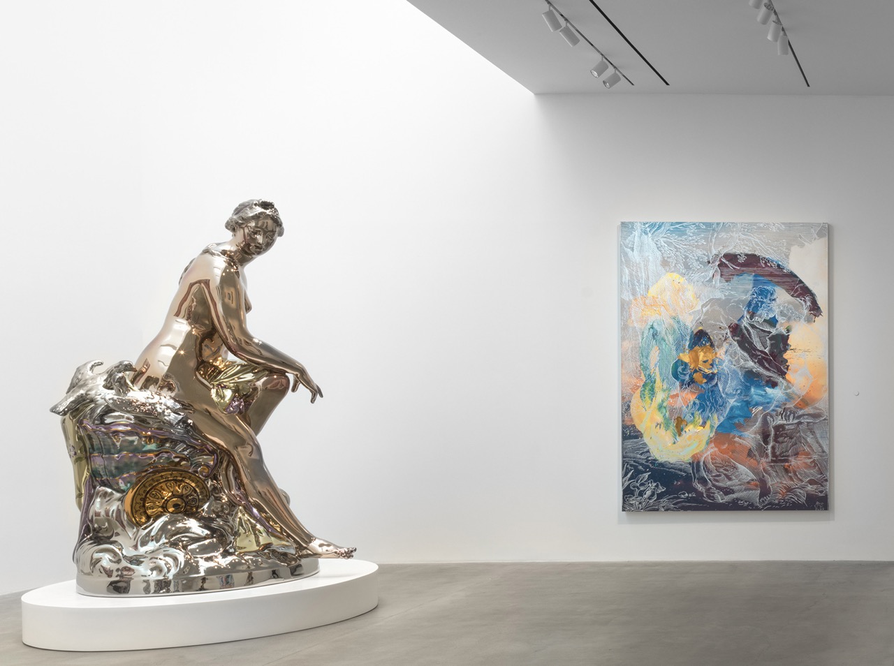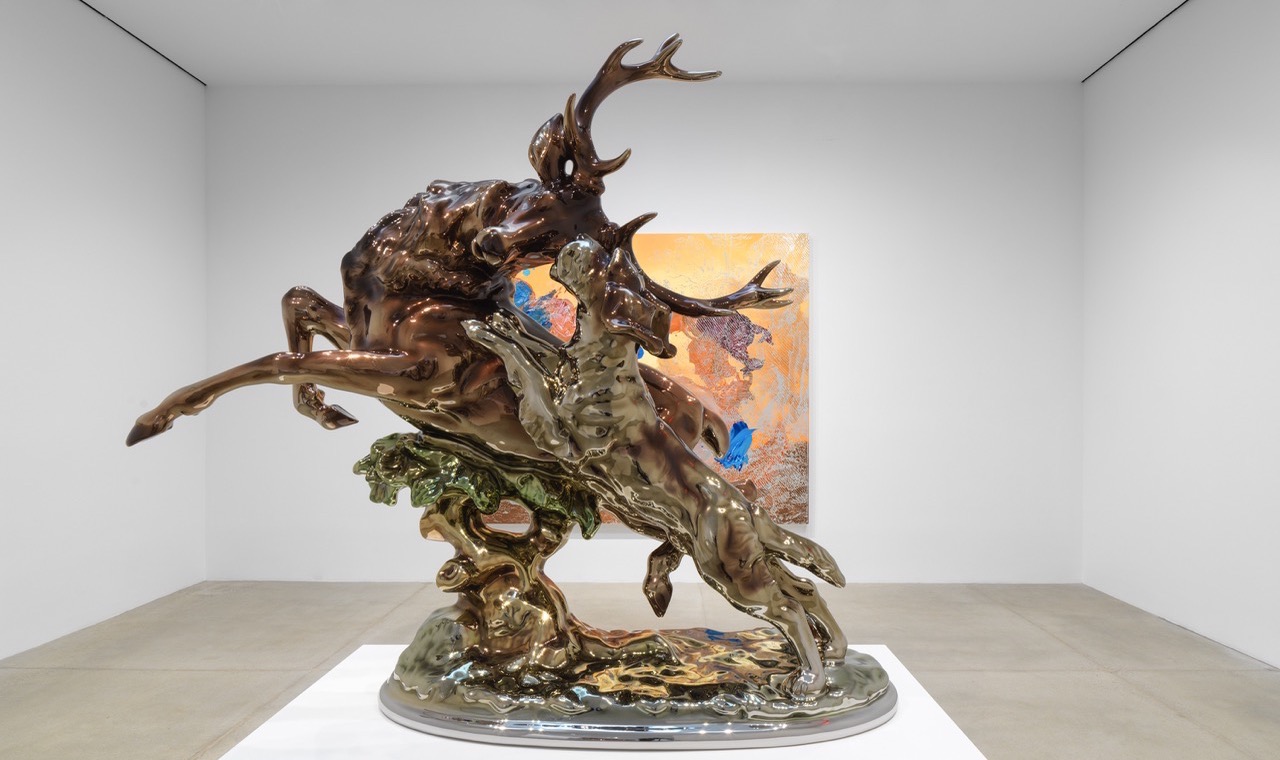 New paintings feature photorealistic backgrounds taken from Spranger, Carracci and Marcantonio Raimondi with big impasto gestural abstraction obscuring sections of imagery. Elsewhere we find a polychrome stainless steel sculpture of Diana, Roman goddess of the hunt and keeper of the forrest. Perhaps Walt Whitman was wrong when he wrote that time avails not. Jeff Koons leverages to his advantage the greater clarity we achieve when looking back across centuries (one reason why Jeff avoids contemporary attire with his lovers sculpture). He quite literally planted his flag in Greece three years ago, when Jeff mounted his Apollo wind spinner on the island of Hydra. You might call this Porcelain Series show a willful historicization of not only his past output, but that of the Counter-Reformation, Cy Twombly, the king’s kitchen and The Judgement of Paris. Distance avails, time avails, Jeff Koons avails.